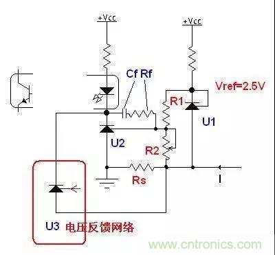 TL431 價格低廉,在開關電源的反饋環(huán)路大量應用,但其FB電壓為2.5V,直接用做電流反饋時要很大的采樣電阻,浪費電壓。圖中用兩個TL431實現(xiàn)電流反饋,可以用比較小的采樣電阻實現(xiàn)精密的電流反饋,如果還有電壓反饋網絡,再并上U3的電壓反饋電路。