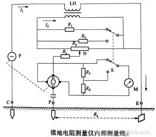 接地電阻測量儀由手搖發(fā)電機(jī)F、電流互感器LH、倍率開關(guān)S、調(diào)節(jié)電位器Rp及檢流計(jì)M等組成,全部機(jī)構(gòu)裝在塑料殼內(nèi),外有皮殼便于攜帶,附件有輔助探棒、導(dǎo)線等,其內(nèi)部測量線路如下圖所示。
