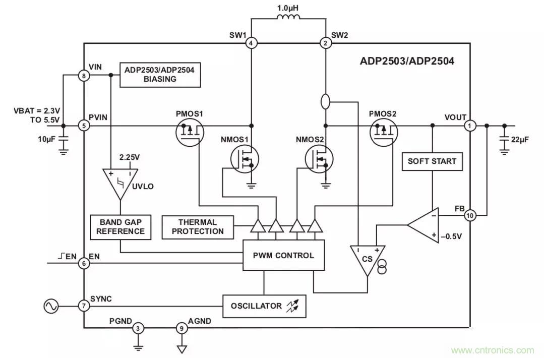 這樣的器件譬如ADI公司的ADP2503和ADP2504降壓-升壓轉(zhuǎn)換器,它們內(nèi)置四個開關、兩個電容和一個電感。