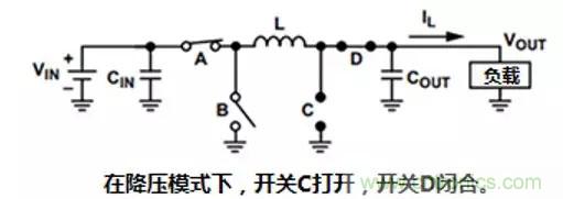 在降壓模式下, 降壓-升壓轉(zhuǎn)換器工作如下圖,Vin大于Vout時,開關C打開,開關D閉合。