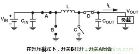 在升壓模式下,Vin小于Vout 時,開關B打開,開關A閉合。這時,開關C和開關D的工作模式如下圖表示。