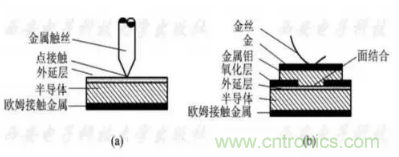 點接觸型管芯用一根金屬絲壓接在N型半導體外延層表面上形成金半接觸。面結合型管芯先要在N型半導體外延層表面上生成二氧化硅(SiO2)保護層,再用光刻的辦法腐蝕出一個小孔,暴露出N型半導體外延層表面,淀積一層金屬膜(一般采用金屬鉬或鈦,稱為勢壘金屬)形成金半接觸,再蒸鍍或電鍍一層金屬(金、銀等)構成電極。
