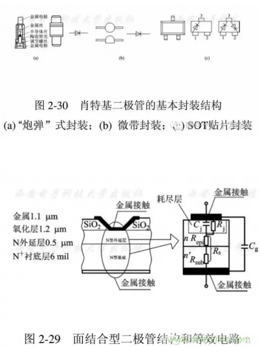 因此性能穩定,一致性好,不易損壞。圖中給出一種面結合型二極管的結構圖和等效電路。從中可以看出各部分的結構尺寸量級。通常這種管芯要進行封裝才能方便地使用。肖特基勢壘二極管的典型封裝結構可采用“炮彈”式、微帶式、SOT貼片式等如圖2-30所示。
