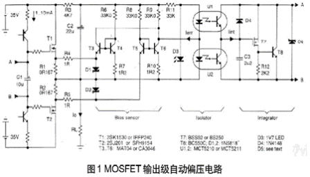MOSFET的偏壓視實際使用的管子而定,通常在2V至10V間變化。為了應對這一范圍,最終確定圖1 所示的自動拓撲結構。積分器采用積分并聯穩壓器,不僅結構簡單,而且有較高的精度,還顯示出足夠低(<2Ω)的動態輸出阻抗,能滿足來自驅動級AC電流的要求。為了排除高頻處的交互作用,積分電容C3的取值應使伺服環的單位增益頻率低于音頻譜。通常在1Hz與10Hz之間,具體數值取決于光耦合器的傳輸比,D4的作用是在管子截止期間讓C3放電,從而保護T7的柵極,想要可靠地工作;積分器輸入端低漏電是至關重要的,因此D4應避免光照。穩壓二級管D5額定值為最大可能偏壓加上少量的余量,以適應特定設計的要求。倘若某個元件發生故障,或加以極端的測試信號,該二級管能保護輸出級免受過大共模電流的損害。