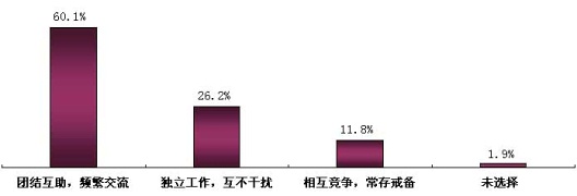 為了更深入了解電子工程師的生存環境,我們特意設置了這個問題。對每一位工程師來說,同事關系處理的如何,直接影響著他們的工作質量和生活質量,良好的同事關系,利人利己,利公利私。特別讓我們欣慰的是,60.1%的電子工程師和同事處于團結互助,頻繁交流的工作狀態,在目前經濟危機的陰霾籠罩下,這樣同事關系顯的尤為重要。(見圖表七)