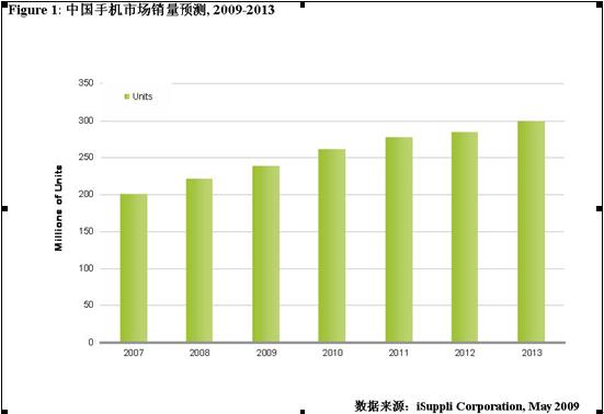 預計中國手機市場2009年的銷量為兩億三千八百萬臺,較去年成長7.8%。然而受經濟危機的影響,全球手機的出貨量將呈現負增長,出貨量為11億部手機。附圖為中國手機市場銷量預測, 2009-2013