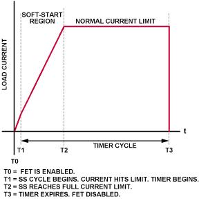利用軟啟動,浪涌電流在軟啟電容設定的期間可以從零線性增加到滿量程。通過逐步提高基準電流,能避免浪涌電流突然達到30 A的限制。需要注意的是,在軟啟過程中,電流處于調整過程中,因此,定時器從軟啟動開始之際就進入工作狀態,如圖5所示。