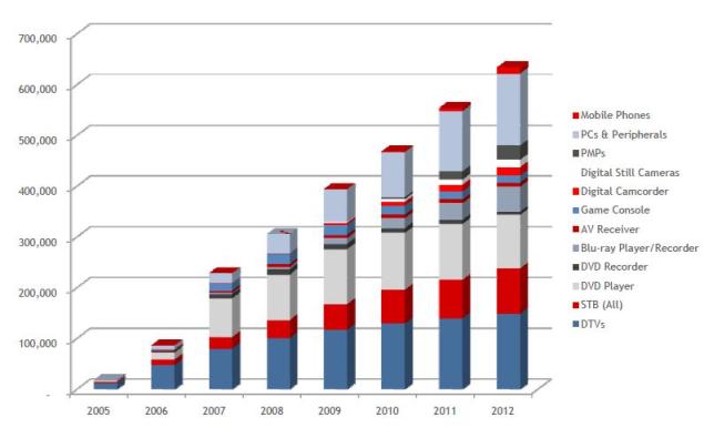圖2  2005年~2012年預(yù)計HDMI裝置出貨量