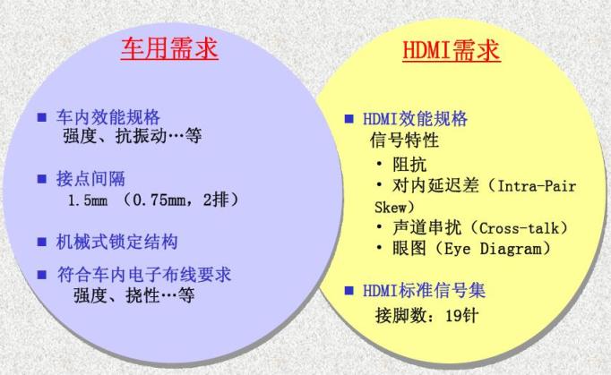 車用視頻系統(tǒng)越來越受歡迎,因此汽車生產(chǎn)商希望在他們的汽車?yán)锛蒆DMI連接功能。HDMI1.4規(guī)格為回應(yīng)汽車生產(chǎn)商的需求,提出了功能強(qiáng)大的新型車用連接系統(tǒng),可在車內(nèi)座椅后方或駕駛面板上的顯示設(shè)備上提供真高清視頻,并同時符合汽車道路駕駛中較為嚴(yán)苛的性能要求。