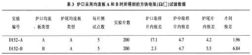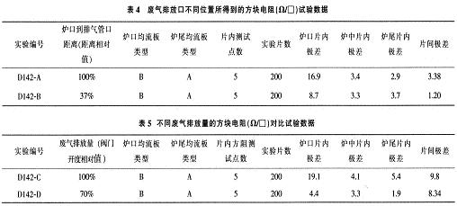 從表4可看出,廢氣排放口離恒溫區越遠,即離爐口越近,爐口的方阻片內/片間均勻性改善越好,但廢氣排放的同時也有大量熱能的排放,在排放口區域聚集的熱能較多,因考慮到爐門的低溫(一般為小于200℃)要求,在一定程度上又限制了排放口到爐門的距離不能太近。所以,生產中廢氣排放口的較佳位置是在一個兩向平衡距離范圍內。