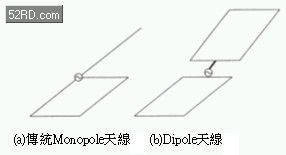 由上式可知如果縮任意小天線大小的話,Pr會(huì)比Pd小導(dǎo)致放射效率大幅降低,這種現(xiàn)象尤其是天線附近的電磁界更加明顯。圖2是提供相同電力給兩種天線時(shí),天線附近的實(shí)際電界分布狀態(tài),圖中的單極(Monopole)天線高度為λ/4(此處λ表示天線頻率的對(duì)應(yīng)波長(zhǎng))屬于中等大小天線,此時(shí)單極天線最大強(qiáng)度大約是-20dB。