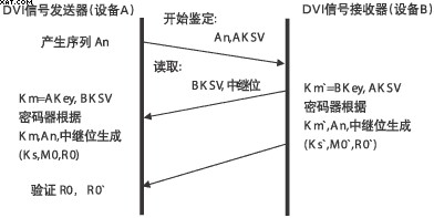 HDCP具體工作過程:首先由主機發送密鑰選擇導引序列(AKSV)和64bit偽隨機序列(An)到接收方,接收方回傳密鑰選擇導引序列(BKSV)和轉發器位(REPEAT-bit)(如是轉發器用以表示身份),發送方確認BKSV是否已被廢除和是否包含20個1和20個0;如果雙方的設備密鑰和KSV有效,則計算產生一個56bit的公共密鑰Km和Km`,然后可產生KS、KS`(傳輸密鑰)、M0、MO`(64bit后續驗證用追加初始序列)、RO、R0`(16bit指示驗證成功,它必須在AKSV發送后100ms內傳回發送方;驗證成功后R01和R0相等;每128幀修正一次,每2s回傳一次)。因此當DVI接口中斷傳輸2s以上,或是非授權設備接收時,主機將停止傳輸內容,以達到保護傳輸內容的目的。HDCP鑒定處理過程如圖6所示。