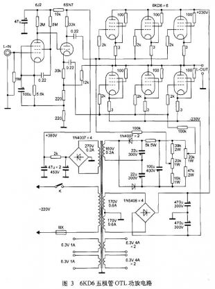 OTL功放級采用SEPP并聯(lián)推挽電路,可選用6KD6、6L6、6P3P等屏壓范圍大的功放管,并將其改為三極管接法。采用6只功放管并聯(lián)的輸出方式,使輸出阻抗達(dá)到8~16Ω。
