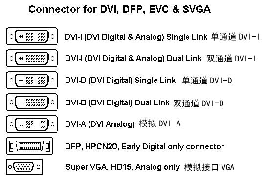 DVI-A是一種模擬傳輸標準,晚期的大屏幕專業CRT中能看見。不過由于和VGA沒有本質區別,性能也不高,因此DVI-A事實上已經被廢棄了。至于DFP接口,這是一種已經被廢棄的早期的數字規范。