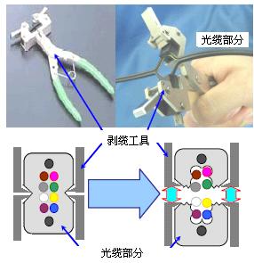 這種纜采用PVC緊套光纖,金屬吊線,PVC或LSZH做阻燃護套層,適合于室內布線使用,性能穩定可靠;采用小彎曲半徑光纖生產,具有優良的抗彎性能;阻燃;施工方便可靠。可以選用專門的工具進行剝纜,從光纜“V”形槽區域剝開,獲得緊套光纖,操作簡單。如圖3所示。