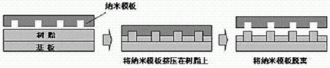在納米印刷工程中,首先用旋轉法等把樹脂薄膜涂覆在玻璃和硅制的基板上,再將樹脂薄膜加熱,使其復合在基板上。然后,在變軟的樹脂上擠壓納米模板,最后再把納米模板從樹脂薄膜上脫離開去。通過以上過程,納米模板表面的圖形就被復制在樹脂薄膜的表面。