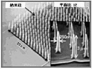 在高寬比納米印刷技術中,可以簡單地形成直徑為25nm、高3μm(平面比為12)的納米級柱狀結構集合體(見圖2)。該結構在以往的精密塑料成型中是很難形成的,但使用了高寬比納米印刷技術,用一次壓延就能成型。