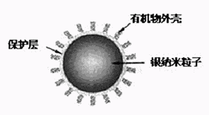 由于納米粒子表面呈活性,為防止其自身凝聚必須要做表面控制。我們所用的納米粒子是平均直徑為10nm左右的銀納米粒子,其表面用有機物保護層進行了涂覆。圖3為有機物—銀復合納米粒子的掃描電鏡圖像,圖4為其結構模式圖。
