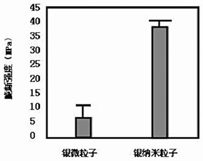 日本大阪大學應用銅質圓板型試驗片作銀納米粒子連接試驗,分別測出了銀微米粒子(平均粒徑為100nm)和銀納米粒子的脆斷強度(見圖7)。其中,該試驗是在300℃、保溫300min、加壓5Mpa的條件下進行的。如圖7所示,納米粒子連接與微粒子連接相比,顯示出了很高的脆斷強度。