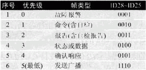 本協議采用幀優(yōu)先原則分配標識符,每一幀標識符中的高四位表示幀類型,不同幀類型有不同的優(yōu)先權,優(yōu)先權決定了各種信息幀在同等情況下的發(fā)送順序,協議中的29位標識符的分配如下: