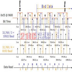 UART數(shù)據(jù)用10,922波特或8,192波特的UART接收。由于UART在傳輸中間點(diǎn)對數(shù)據(jù)進(jìn)行采樣以補(bǔ)償抖動,因此該點(diǎn)已經(jīng)被選擇為接收UART的采樣點(diǎn)。在沒有行抖動的理想情況下,10,922波特UART對第三數(shù)據(jù)位的開始兩次讀數(shù)都會是錯誤的而8,192波特的UART由于會完全遺漏第三位,很快就將出錯。由于低功耗應(yīng)用的理想時鐘是低功耗實時時鐘模式,這使得在低功耗環(huán)境中處理很困難。解決這一問題的最好辦法就是將µC與調(diào)制技術(shù)結(jié)合使用,用32kHz振蕩器提供非常精確的2,400波特,并完全能支持9,600波特(參見圖3)。