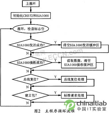 單片機AT89C52在系統(tǒng)中主要起到一個橋梁和協(xié)調(diào)控制的作用。主機通過CH372把數(shù)據(jù)發(fā)送到單片機,單片機再把數(shù)據(jù)通過SJA1000發(fā)送到CAN總線,從而實現(xiàn)整個系統(tǒng)的通信。此外,單片機還需要對CH372和SJA1000進行初始化,并通過地址/數(shù)據(jù)以復用的方式訪問CH372和SJA1000。由于在訪問其中一個芯片時,如果另一個芯片還保持有輸出,那么單片機就不能讀到正確的數(shù)據(jù),因此,單片機要通過片選控制信號分配有效地址。單片機主要通過主循環(huán)來監(jiān)控系統(tǒng)的通信,其主循環(huán)流程圖見圖2所示。[page]