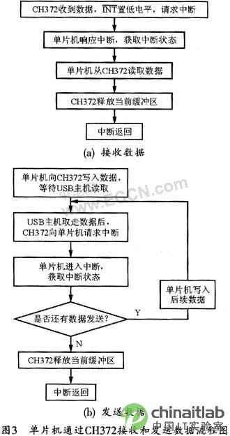 CH372芯片專門用于處理USB通訊。在接收到數(shù)據(jù)或發(fā)送完數(shù)據(jù)后,CH372將以中斷方式通知單片機進行處理。單片機通過CH372接收和發(fā)送數(shù)據(jù)的流程圖如圖3所示。