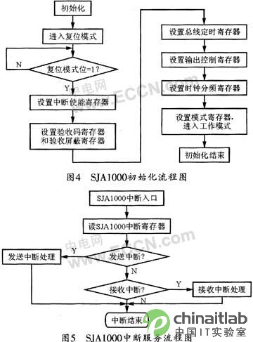 在CAN總線端,單片機控制著傳輸流程。SJA1000的初始化由單片機完成,其初始化流程圖見圖4所示,在正常工作模式下,單片機可控制SJA1000的收發(fā)等操作,以完成和CAN總線的通信。當主機端傳來數(shù)據(jù)時,單片機將數(shù)據(jù)轉(zhuǎn)發(fā)到SJA1000的發(fā)送緩沖區(qū),并由SJA1000根據(jù)CAN協(xié)議自動封裝后發(fā)送到CAN總線上;當SJA1000接收到來自CAN總線上的一個有效的報文后,系統(tǒng)將在INT引腳上產(chǎn)生一個硬件中斷信號(低有效),當單片機收到中斷信號后,即進人中斷服務程序,以完成數(shù)據(jù)的接收和處理,其中斷服務流程見圖5所示。