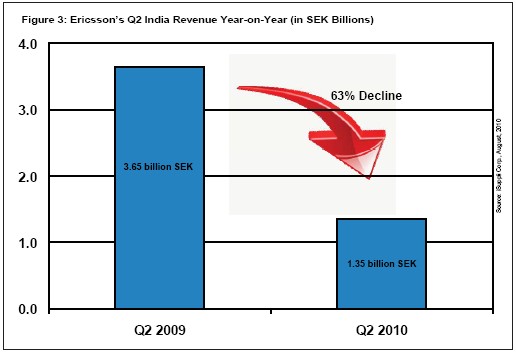 今年7月,諾基亞西門子通信和愛立信報(bào)告稱,其第二季度營業(yè)收入因印度的審查延誤而大幅減少。諾基亞西門子通信稱減少2.57億美元。愛立信沒有給出具體的損失數(shù)字,但該公司在印度的營業(yè)收入同比下降63%,相當(dāng)于總計(jì)損失了3.12億美元,如圖3所示。