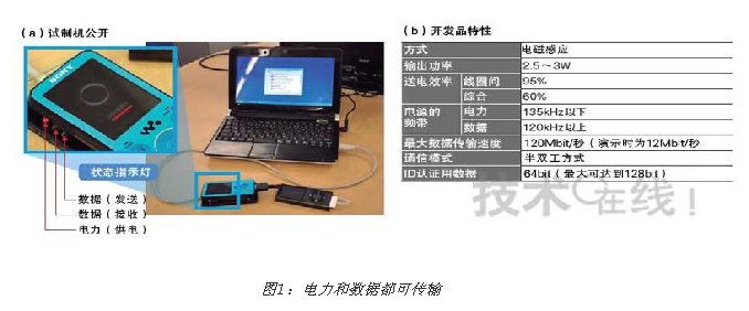 公開了使用索尼“Walkman”和蘋果“iPod nano”的試制機(a)。可將最大120Mbit/秒的數據與電力一起進行傳輸(b)。[page]