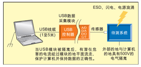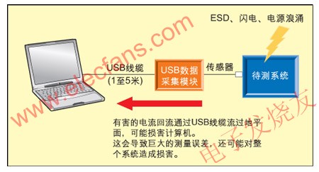 圖2:未隔離的USB數(shù)據(jù)采集模塊在ESD、閃電、電源浪涌的時(shí)候可能損害系統(tǒng)并導(dǎo)致數(shù)據(jù)不正確。