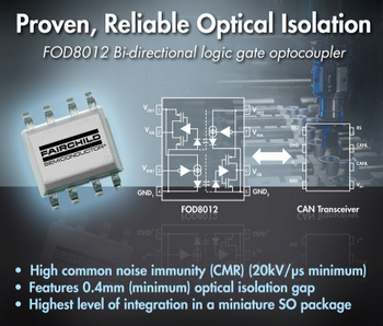為幫助設計人員應對挑戰,飛兆半導體公司(Fairchild Semiconductor)開發出業界首款全雙工、雙向邏輯門光耦合器FOD8012,它具有高抗噪能力和經驗證的可靠光隔離性能,適用于工業現場總線通信、可編程邏輯控制、伺服控制,以及逆變器、工廠自動化、過程控制和測試測量等應用。