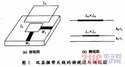 [page]1.3雙層微帶天線的尺寸參數本文采用的基板是TACNIC公司的介質基板,ε1=2.65,h=O.5mm。其中,上貼片L2=95mm,下貼片L1=70mm;底層介質基板的厚度為h1=1mm,中間空氣層的厚度為h2=13mm,介電常數為ε2=1.0(也可以采用介電常數接近于1的泡沫材料代替空氣層,本文選擇用空氣層來達到降低有效介電常數的目的)。