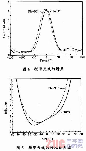 由圖4可以看到,雙層微帶天線的增益達到了5.2dB,較之傳統的微帶天線增益有少許增加,由此可見,雙貼片的微帶天線在提高增益方面也有一定的貢獻。若要大幅度提高微帶天線的增益,則可以在頂層貼片上再覆蓋一層εr>>1的介質基板即可。從圖5中可以看出,微帶天線的部分軸比小于3dB,從而實現了天線的圓極化,但是微帶天線的最大輻射方向偏離軸向,天線的軸向比變差。該微帶天線基本可以滿足圓極化的要求。