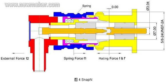 但跟傳統的螺紋連接的N 相比,SnapN 還是有局限性。我們知道 SnapN 外導體端面之間的接觸壓力由其彈簧A 提供--ROSERBERGER 提供的數據是30N,根據力的相互作用原理,我們可以知道接頭的結合力也是30N。在某些應用場合,由于粗重電纜的擺動,傳導到接頭的作用力很容易超30N,一旦超過這個臨界力,外導體端面之間會發生瞬時分離,而影響信號傳輸。那是否能提高這個臨界力呢?我們知道,彈簧A 對外導體端面提供的接觸壓力與接頭的結合力是等量的,如果我們增加彈簧作用力---比如增加到100N,那意味著接頭結合力也達到100N,顯然,匹配一對接頭需要用100N 的力氣是讓人無法接受的。