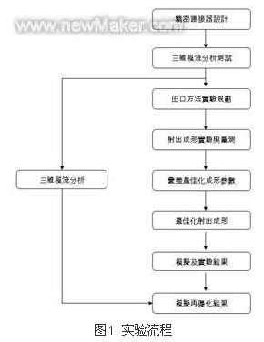透過本研究實驗所規劃之流程(圖1),搭配田口實驗規劃法,加以探討模流分析與實際射出成形所得之結果,是否可有效改善塑料平坦度,進而獲得最佳化之射出成形參數。