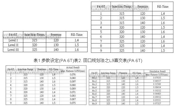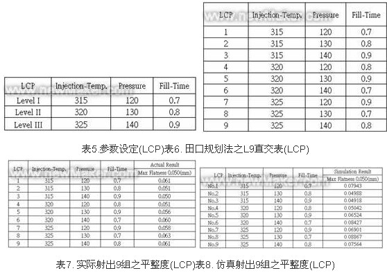 塑料射料LCP在已設定射出溫度、射出壓力、充填時間之條件參數后,再設定仿真之各參數,如表5所示。透過田口方法實驗規劃,可得L9直交表,如表6所 示。依據L9直交表,可清楚得知有9組田口規劃之實驗參數,再分別針對這9組參數,實際作射出成形,并量測實際翹曲度,量測之結果,大部份數據皆不符合塑 料翹曲度(Flatness) 0.05mm規格內,如表7所示。仿真之最佳化參數為第三組,其參數為射出溫度315℃、射出壓力 140 MPa 、充填時間0.9 s,如圖3所示。
