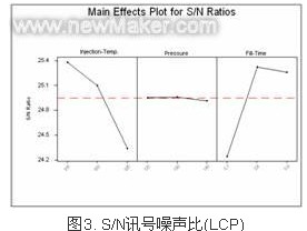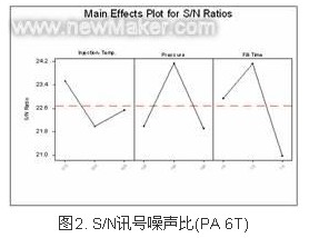 由實驗數據輸入田口法計算機程序后,經因子變動計算,可得S/N(訊號/噪聲比),如圖2所示。由S/N得到最佳化參數為,射出溫度315℃、射出壓力 130 MPa、充填時間1.5 s。此最佳化參數出現于田口規劃法L9直交表內之第二組實際數據,而且實際射出與仿真射出所得之數據也都是第二組為最佳的,由此可得知PA 6T田口法最佳化組合與實際射出與仿真射出是互相對應的,符合理論與實務相互映證,最佳化成形之塑料其平坦度為0.04mm,符合平坦度不超過 0.05mm之目標值。
