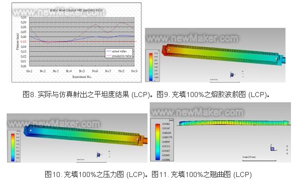 從LCP之S/N(訊號/噪聲比),可觀察出,除 了射出溫度外,射出壓力與充填時間,均未有相當明顯的趨勢,S/N(訊號/噪聲比)亦是取最大值,故所呈現之最佳參數為射出溫度315℃、射出壓力130 Mpa、充填時間0.8 s,這組最佳化成形參數,正好出現于田口規劃法L9直交表內之第2組實驗數據,然而實際射出成形第二組之塑料平坦度數據為0.051mm,此量化數據未符合于0.050mm目標值內,實際射出最佳值是第3組,其平坦度數據為0.050mm符合目標值之內,與田口法之最佳化組合相比,兩者不相符;其余8組均未符合不超過平坦度0.050mm目標值內。實際射出之數據中,第三組實驗數據是0.050mm最佳的,次者為第二、四組,兩組實際射出之塑料平坦度為 0.051mm;在此說明為何田口規劃之第二組最佳化成形,于實際射出中,并不是最好的,因為從S/N(訊號/噪聲比) ,可觀察出,射出溫度的斜率趨勢是相當清楚的,但射出壓力所呈現之斜率趨勢卻是相當不明顯的,并且其值已相當接近S/N標準值(紅色虛線),這顯示在此射料LCP中,射出壓力所扮演的參數,并不屬于關鍵參數,但反之也可以說,因設定之射出壓力太高,導致斜率趨勢不明顯,然就充填時間0.8s、0.9s而言,其呈現兩者相互接近之狀況,與0.7s區隔相當明顯,這顯示出時間以0.8s、0.9s,均為佳,0.7s是不可行之參數。綜合上述之因素,可能因為設定射出壓力過大,導致射出成形之實驗值,無法很明確被區分,對此將安排實驗,以厘清射出壓力影響程度為何,故田口規劃法L9直交表內之第二組實驗數據最佳化成形之組合,雖然未符合不超過0.050mm目標值內、但與三、四組均相當接近,僅差0.001mm,如圖8所示,此實驗仍具有參考性,從仿真射出中可得到LCP所須之壓力較小,如圖9-圖11所示,在此可得知,射出溫度為最重要,次之為射出時間,再者為射出壓力。