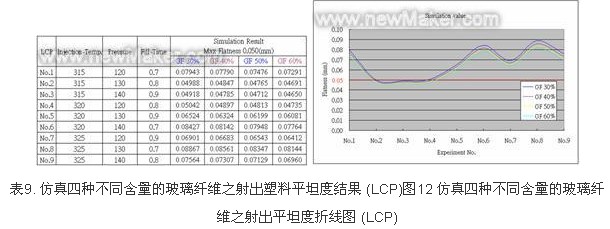 因射出壓力所呈現之斜率趨勢卻是相當不明顯的,并且其值已相當接近S/N標準值(紅色虛線),這顯示在此射料LCP中,射出壓力所扮演的參數,并不屬于關鍵參數,但反之也可以說,因設定之射出壓力太高,導致斜率趨勢不明顯,如果調降射出壓力的話,或許可以找出更有利找出射出壓力之最佳參數,為此,再次以仿真方式,將9組壓力參數全部調降70 MPa,然射出溫度與時間均維持不變,來反推壓力是否有影向到塑料平坦度品質,仿真結果發現,壓力經全部調降60 MPa后,再次仿真,所得之塑料平坦度數據,均與未降調射出壓力之時,所得之塑料平坦度數據是相同的,這顯示壓力在LCP塑料而言,不是重要的因子,這也映證即有之基礎理論,因為LCP塑料其流動性高,故其所使用之射出壓力,遠比PA 6T塑料,來得低許多。此時面臨到,成形參數已無法再作調整時,又為了找出如何優化LCP所射出之塑料平坦度時,特別安排一仿真實驗,于LCP塑料中,增加其玻璃纖維含量,藉由不同比例之玻璃纖維含量,來優化塑料平坦度,實驗方式,安排四組不同比例玻璃纖維成量,含原先30%之玻璃纖維含量,增加為 40%、50%與60%,實驗結果發現,LCP塑料,隨著增加玻璃纖維至40%、50%及60%之后,其塑料平坦度愈來愈更好了,這是因為玻璃纖維有助于加強塑料的強度,可有效改善了塑料平坦度,60%玻璃纖維含量,最大可改善0.00723mm,如表9、圖12所示。
