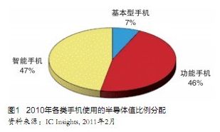 平均算來,現今一部手機使用的半導體價值約30美元,世界全部手機使用的半導體總值約占半導體市場近20%,是僅次于PC和消費電子的第三大應用產品,足見其影響力。智能手機的半導體含量更大,它裝備更加優良的處理器,更多的DRAM和NAND。據稱,它與基本手機半導體含量之比約為9:1,其對半導體業的重要性更可見一斑。市場調研公司IC Isights報告指出,2010年世界手機使用半導體產品共425億美元,其中智能手機(Smartphone)200億美元,占47%,首次超過增強型手機(Enhanced),基本型手機(Basic)用半導體僅30億美元,占7%(見圖1)。預計2014年手機使用半導體將增至555億美元,年均增長率7.5%,智能手機使用半導體則將以每年20%的速度迅猛成長,屆時將達416億美元,獨占手機用半導體的75%,相反基本型手機屆時將進一步縮減至僅為16億美元,只及2010年的一半。
