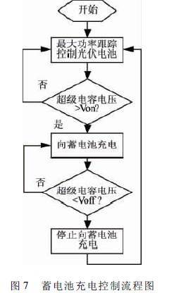 圖7為蓄電池充電控制策略。該策略在低光照情況下采用超級(jí)電容電壓的滯環(huán)比較控制策略,以超級(jí)電容兩端電壓作為反饋采樣信號(hào)。若超級(jí)電容兩端電壓低于設(shè)定下限值Voff,則停止向蓄電池充電,光伏控制器采用最大功率跟蹤對(duì)超級(jí)電容充電;當(dāng)超級(jí)電容電壓充到足夠大為Von時(shí)(Von>Voff),以蓄電池的三段式10小時(shí)充電法向蓄電池充電;若此時(shí)持續(xù)低光照,則當(dāng)超級(jí)電容電壓重新下降到下限值Voff時(shí),再次停止向蓄電池充電,如此循環(huán);在足夠光照情況下,當(dāng)超級(jí)電容的電壓超過Von時(shí),系統(tǒng)對(duì)蓄電池以三段式10小時(shí)充電法充電,同時(shí)超級(jí)電容電壓也會(huì)繼續(xù)上升,這時(shí)控制器保持超級(jí)電容的電壓值不超過新的上限值Vmax。