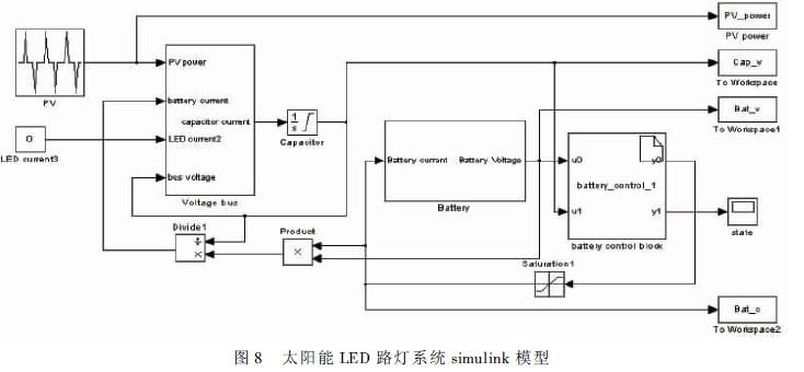根據(jù)以上數(shù)據(jù)在仿真模型中建立simulink/matlab模型,模型按照?qǐng)D1所示的系統(tǒng)結(jié)構(gòu)建立,采用帶有最大功率跟蹤的光伏電池控制器,把光伏電池上的電能傳輸?shù)街苯硬⒙?lián)超級(jí)電容的直流母線上。同時(shí)電能通過蓄電池充放電控制器給蓄電池充電。如圖8所示,該系統(tǒng)的simulink模型主要有PV模塊、LED模塊、直流母線模塊、蓄電池模塊、超級(jí)電容積分模塊、蓄電池充電控制器模塊。