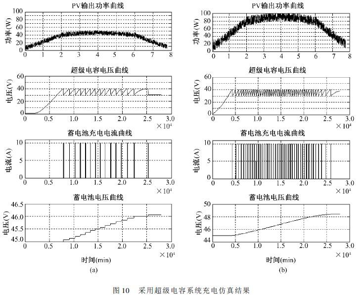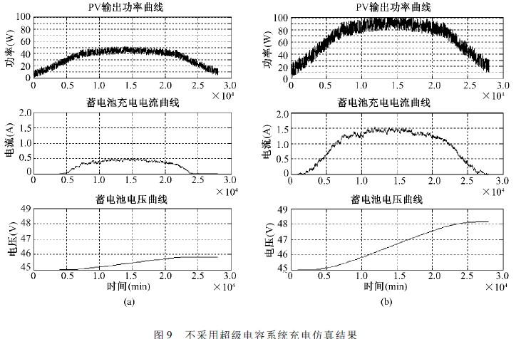 對(duì)比兩種系統(tǒng)結(jié)構(gòu),從蓄電池最終電壓可以看出,弱光照情況下,使用超級(jí)電容系統(tǒng)的光伏電池的利用率上升,蓄電池電壓變化值約為不采用超級(jí)電容的蓄電池電壓變化值的120%,即在弱光照下,系統(tǒng)的光伏發(fā)電效率提高了大約20%。而在晴天,有足夠光照的情況下,雖然在早晚光照較弱時(shí),其發(fā)電能力得到提高,但由于多引入一級(jí)變換器,在較高功率下,采用超級(jí)電容沒有對(duì)系統(tǒng)的發(fā)電效率有明顯的提高。由上,采用超級(jí)電容的獨(dú)立光伏系統(tǒng)在光照不足的地區(qū)能對(duì)發(fā)電能力有明顯的改善。