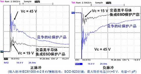 圖1:安森美半導(dǎo)體集成硅ESD保護(hù)元件擁有比競(jìng)爭(zhēng)器件更優(yōu)的鉗位電壓性能。