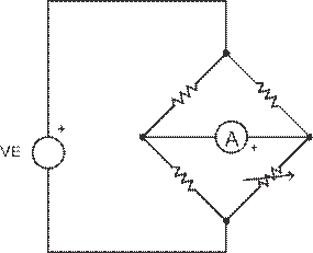 圖 4 所示的惠斯通橋接是一款我們所熟悉的電路,主要用于高精度地測量電阻。1833 年, Hunter Christie 發明了這種電路,隨后 Charles Wheatstone 對其進行了研究,并做了廣泛的分析,Wheatstone 橋接便因此得名。Wheatstone 還首次運用獨特的鉆石形風格繪制這種電路,并一直沿用至今。