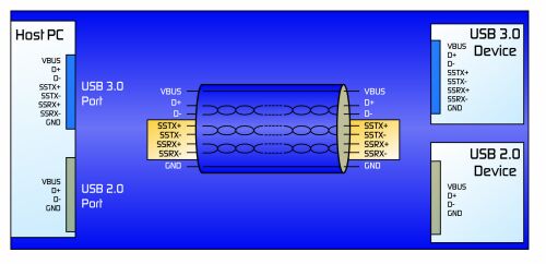 USB 3.0增加了4個接到連接器的新引腳,以支持新的SuperSpeed接口:USB3_TX(差分對)和USB3_RX(差分對)。