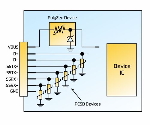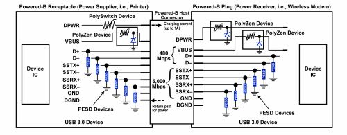 對于USB 3.0設備,PolyZen器件可安裝在USB輸入端口的VBUS上、Powered-B插頭的DPWR端口、桶形插座電源端口、以及USB集線器的VBUS輸入端。