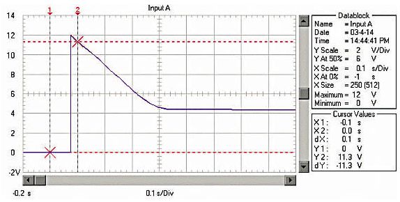 由于RM、RB、RL均非常低,啟動電流非 常大。例如用12V、45Ah的蓄電池啟動安裝1.9升柴油機的汽車,蓄電池的電壓在啟動瞬間由12.6V降到約3.6V!啟動過程的蓄電池電壓波形如圖 1;啟動瞬時的電流達550A,約為蓄電池的12C的放電率!啟動過程的蓄電池電流波形如圖2,(電流傳感器的電流/電壓變換比率:100A/V)。盡管 車用蓄電池是啟動專用蓄電池,可以高倍率放電,但在圖1中可以看出,10倍以上的高倍率放電時的蓄電池性能變得很差,而且,如此高倍率放電對蓄電池的損傷 也是非常明顯的。啟動過程的電壓劇烈變化也是極強的電磁干擾,可以造成電氣設備的“掉電”,迫使電氣設備在發電機啟動過程結束后重新上電,計算機在這個過程中非常容易死機。因此,無論從改善汽車電氣設備的電磁環境還是改善汽車的啟動性能和蓄電池的性能、延長使用壽命來考慮,改善汽車電源在啟動過程的性能是必要的。