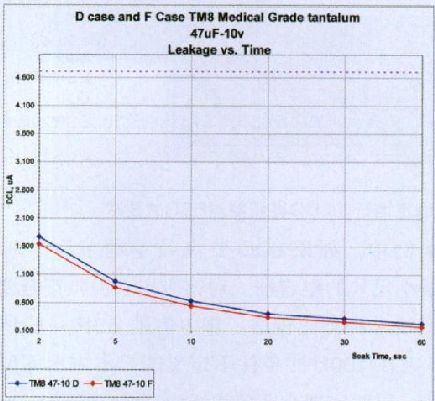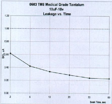 圖8是一種47uF-10V的鉭電容,雖然其最大DCL為4.7uA,根據特定的保壓時間篩選后,可為應用提供超低DCL.以圖8的元件為例,該批量可以按照10秒鐘DCL 600nA的標準篩選,從而把總體 DCL 從 4.7uA 降至 600nA 限值。